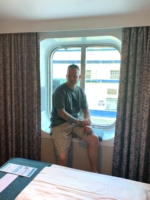 Nach erneuter Angabe sämtlicher Daten (hab ich doch alles schon beim online-checkin gemacht), Einlesen der Pässe und Hinterlegen einer Bezahlkarte für die Bordrechnung dürfen wir endlich an Bord! Da uns heute morgen ja schon die Nachricht erreichte, dass unsere Kabine fertig ist, steuern wir diese auch als erstes an. Wir haben uns im März, als wir die Reise gebucht haben, für eine Außenkabine entschieden. Heißt, du hast ein Fenster aber das kann man nicht öffnen. Unser Motto: Ich habe oben auf Deck 14 den größten Balkon der Welt.