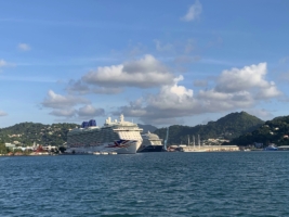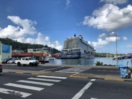 Wir entdecken eine kleine Bar, die schon (oder noch?) geöffnet hat, ein kleiner Straßenverkauf an einer Ecke mit Sicht auf unser schönes Schiff. Hier kaufen wir uns das einheimische Bier. Das haben wir übrigens auf jeder Insel gemacht, sofern es eigenes Inselbier gab. Das hier heißt wie die Hauptattraktion: Pitons. Das sind zwei Felsen, die im Süden der Insel hoch aufragen und als Fotomotiv unheimlich beliebt sind. Das ist übrigens auch das Ziel unserer nachmittäglichen “Minikreuzfahrt”, die wir mit TUI unternehmen werden.