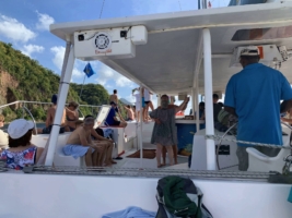Es geht in eine Bucht, die schon von weitem komplett überfüllt wirkt mit unzähligen anderen Ausflugsbooten, welche am Strand dicht an dicht ankern. Hier schiebt sich unser Katamaran auch noch dazwischen und man gibt uns zu verstehen: Badestopp! Wir müssen alle ziemlich bedröppelt geschaut haben?! Häh? Hier so? Zwischen die ganzen großen Boote? Laut Beschreibung “vom Katamaran” stimmt zwar – ja, aber hier? An Land sollte man nicht, das wollte auch keiner, denn war komplett vermüllt. Okay, dann halt wenigstens eine kleine Abkühlung. Kaum waren wir mit ein ein paar anderen Gästen im Wasser, begann ein aggressiver Verkauf von Kajaks aus, die einfach zwischen die Schwimmenden und Badenden gepaddelt sind. Aggressiv und aufdringlich. Souvenirs und Getränke zu total überteuerten Preisen. Uns ist der Spaß vergangen – zurück an Bord. Wir haben uns sehr unwohl gefühlt.