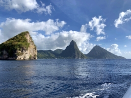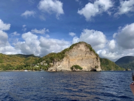 Das war also der Badestopp auf den wir uns gefreut haben. Nun gut, wir müssen das Beste aus der Situation machen. Der Tag ist schon halb rum, und wir haben außer das Hafenviertel und die Marigot Bay diese Insel noch nicht kennen lernen dürfen. Uns schwant, dass sich das auch nicht mehr wirklich ändern wird. immerhiin ist die Stimmung an Bord unseres Katamarans etwas heiter, ein paar tanzen sogar. Anderthalb Stunden später kommen die Wahrzeichen der Insel in Sicht. Die Pitons! Diese Vulkankegel sind wirklich extrem beeindruckend, auch von Wasser aus. Ich trauere ein wenig der Möglichkeit hinterher, diese von Land aus zu bestaunen. Ungefähr 800 Meter erheben sie sich majestätisch aus dem Meer, sattgrün bewaldet. Kein Wunder, dass sie bei den indianischen Ureinwohnern als Götter verehrt wurden.