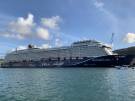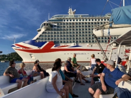 Klingt doch eigentlich ganz chillig, oder? Es geht also mal wieder im Gänsemarsch durch den Check-out und unsere doch recht große Gruppe wird auf einen Katamaran gebeten, gestopftevoll ists am Ende. Pünktlich gehts los und als erstes passieren wir auf voller Länge unsere Mein Schiff 2. Das ist mal ein ganz besonderer Anblick, den man hier von Wasser aus hat. Es dauert gefühlt ewig, bis wir endlich vorbei sind.