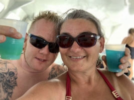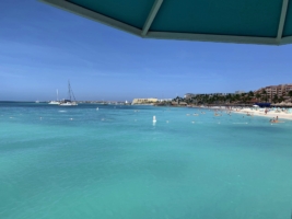 Aber nun, raus, zwei Kaltgetränke an der Bar geordert und ein schattiges Plätzchen am Strand gesucht. Zuerst hatten wir die kühne Idee, eine der Liegen zu buchen, aber der Verleiher wollte 50 US$ für die zwei Stunden. Nö! Handtücher im Sand, im Schatten des Stegs – reicht vollkommen aus, um ne Runde zu chillen. Wir gehen auch ne Runde schwimmen. Aber irgendwie ist das hier nicht so unseres. Aruba ist – zumindest hier am Palm Beach – einfach zu touristisch versnobt, komplett amerikanisiert.