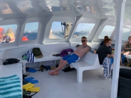 Leider sehe ich nicht wirklich etwas. Das gute Stück liegt wie gesagt auf 18 Metern Tiefe und ohne Brille – keine Chance. Ich dümpele ein wenig rum, während der Gatte versucht, zum Wrack hinunter zu tauchen. Tja, da macht ihm aber der gestrige Abend einen Strich durch die Rechnung und er bricht vorsichtshalber ab …. 🙂 Wir genießen die Gastfreundschaft unseres Veranstalters und lassen uns gemütlich zum zweiten Spot segeln. Zum Glück hat man auf diesem Schiff die Möglichkeit, auch mal ein schattiges Plätzchen aufzusuchen.