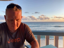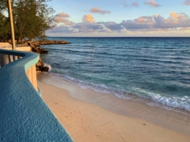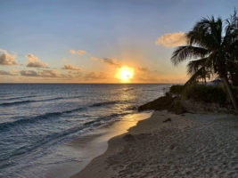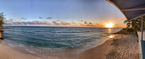 Wir richten uns ein wenig ein, erkunden die Hotelanlage (Pool, Terrasse, Bar, Restaurant) und machen uns auf den Weg – rein ins Leben. Wir laufen über den berühmtberüchtigten St. Lawrence Gap aber sind leider noch zu früh dran, hier ist noch Totentanz. Abends soll hier allerdings die Post abgehen. So lange wollen wir aber nicht warten, trinken einen Eimer karibisches Bier in einer kleinen Bar und suchen uns ein schönes Lokal (das “Mimosas”), wo wir ein leckeres Abendessen bekommen. Das Essen tritt bei diesem phänomenalen Sonnenuntergang fast in den Hintergrund. Wow!