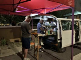 Da hinten in der Ferne liegt irgendwo unser Schiff und macht sich bald bereit, auszulaufen und vielen neuen Gästen zwei traumhafte Wochen zu bescheren. Wir schlendern auf dem Heimweg über den St. Lawrence Gap, der jetzt ein wenig zum Leben erwacht, nehmen einen Rum bei “Frederico” an seiner mobilen Ausschenkerei, sehen den Einheimischen beim “sporteln” zu und besuchen ein Fußballspiel. JAN war neugierig – hat nachgefragt und erzählt bekommen, dass das hier grad das Spiel St. Michael gegen St. George ist und zwar die U18. Aaaaha! Die Spielfeldbegrenzung war übrigens ein dickes Seil, welches in schönen Wellen da lag. Wer wagt es hier, ein “aus” zu pfeifen? Mittlerweile ists abends 8 Uhr und immernoch sehr warm. Wir beneiden die Jungs nicht, sich in der Wärme abzustrampeln.