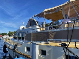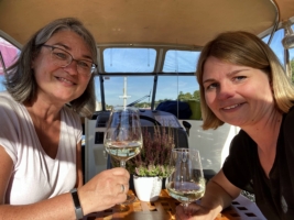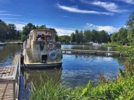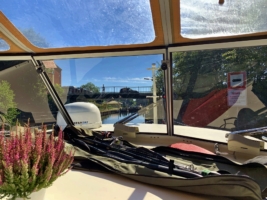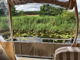 Fazit: dieses Hausboot hat drei Kabinen für jeweils 2 Personen und man könnte auch noch die Sitzecke unten im Essbereich im Inneren des Bootes für 2 Personen herrichten. Aber ideal ist sie für 6 Personen. Laut den Aussagen unserer Skipper super leicht zu steuern, sie liegt schön im Wasser. Wer allerdings aber viel sehen will, der sollte beachten, dass sie echt breit und vor allem – wegen der Brücken – sehr hoch ist. Immer die Angaben in der Wasserkarte beachten! Aber wir würden die “La Palma” immer wieder buchen, denn sie hat eines, was wir in der ganzen Woche nicht nochmal gesehen haben – diese unglaublich bequeme und gemütliche Sitzecke oben an Deck. Das war (nicht nur für mich!) der schönste Platz an Bord.