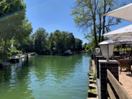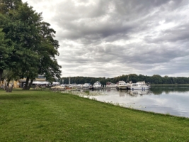 In unserer Gewässerkarte entdecken wir den Anleger “Zum Achter” am Tietzowsee. Den steuern wir gleich an und schon von weitem sehen wir nur noch einen einzigen freien Liegeplatz, der für unseren großen Kahn passend erscheint, parken rückwärts ein – angekommen!