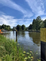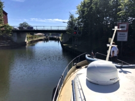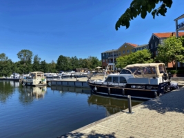Wir frühstücken und fahren zurück zu unserer Heimatmarina, wo wir Schmutzwasser abgeben und frisches aufnehmen. Zwischenzeitlich fahren wir Mädels schnell die Vorräte auffüllen und gegen mittag legen wir auch schon wieder ab und nehmen dieses mal die andere Richtung. Auch hier – gleich am Ende des Sees – kommt eine Schleuse. Vor dieser hat unser Hafenmeister uns gewarnt, dass man als Anfänger nicht unbedingt gleich hier rein sollte. Mutig, da wir ja nun schon mehrere Schleusen hinter uns haben, fahren wir ein. Okay, wir wissen schnell, was er meint. Die Bugwelle ist schon stark und die Crew gibt alles, das Boot still zu halten. Alle Achtung!