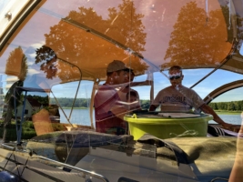 Das kann doch nicht wahr sein. Erst Mama Schnitz, dann hat uns gestern abend der kleinste Schnitz einen ausgefallenen Schneidezahn präsentiert. Und nun das? Der reinste Zahnurlaub. Da bekommt man ja schon aus lauter Sympathie Phantomschmerzen. Tja, wir bemühen die Handys und finden zwei Zahnärzte in Wesenberg. Die Stadt liegt genau auf er anderen Seite dieses Sees, wir lichten den Anker und fahren einmal über den See. Direkt an den Anleger können wir nicht, zu schmal und nicht tief genug für unseren Pott. Also muss der schmerzgeplagte JAN per Ruderboot übergesetzt werden. Keine 10 Minuten später ist er schon wieder auf dem Rückweg. Der eine Arzt hat Urlaub und der andere macht erst Nachmittag wieder auf. So sitzen wir ein wenig fest hier, verbringen die Zeit bis dahin mit Schwimmen und Chillen, bevor JAN wieder Ruderboot fährt. Diesmal dauert es zwar eine Stunde, bis er wieder zurück kommt, dafür ist er aber einen Zahn los. Der musste raus, der Kollege. Unsern JAN kann schon wieder lachen, wenn auch noch etwas betäubt aber die Schmerzen sind endlich weg!