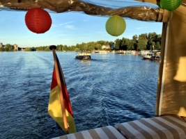 Unsere zwei zukünftigen Skipper-auf-Zeit müssen dann zum Theorieunterricht. Dauert nochmal ca drei Stunden und gleich danach testen sie das neu erworbene Wissen, als wir eine kleine Ausfahrt in die Abendsonne machen. Wir stoßen auf die vor uns liegende außergewöhnliche und mit Sicherheit sehr spannende Woche an. Die erste Nacht werden wir noch hier im Hafen verbringen und morgen voller Elan in die Mini-Kreuzfahrt auf der Mecklenburgischen Seenplate durchstarten. AHOI.